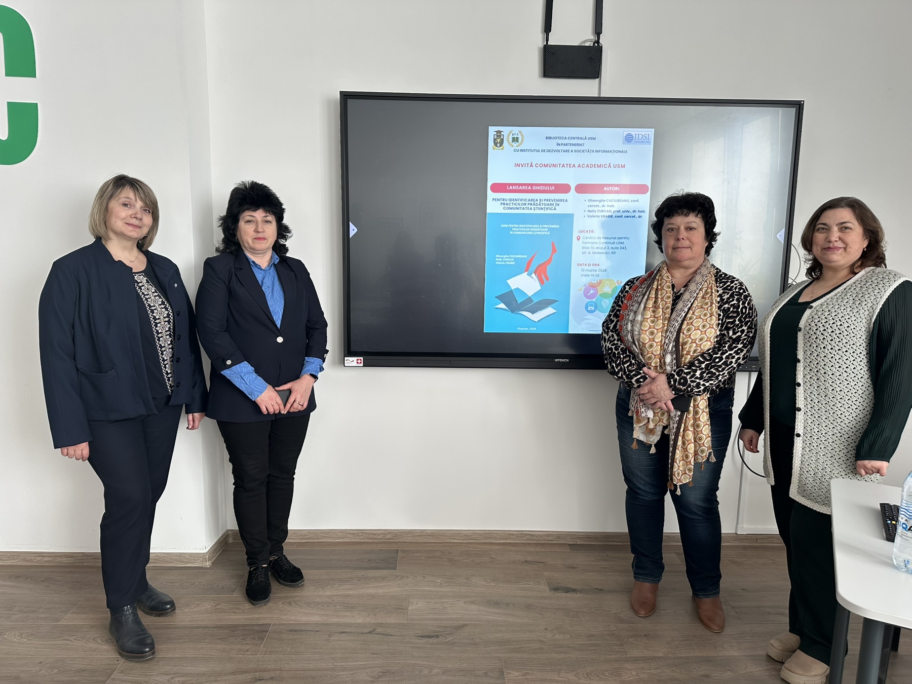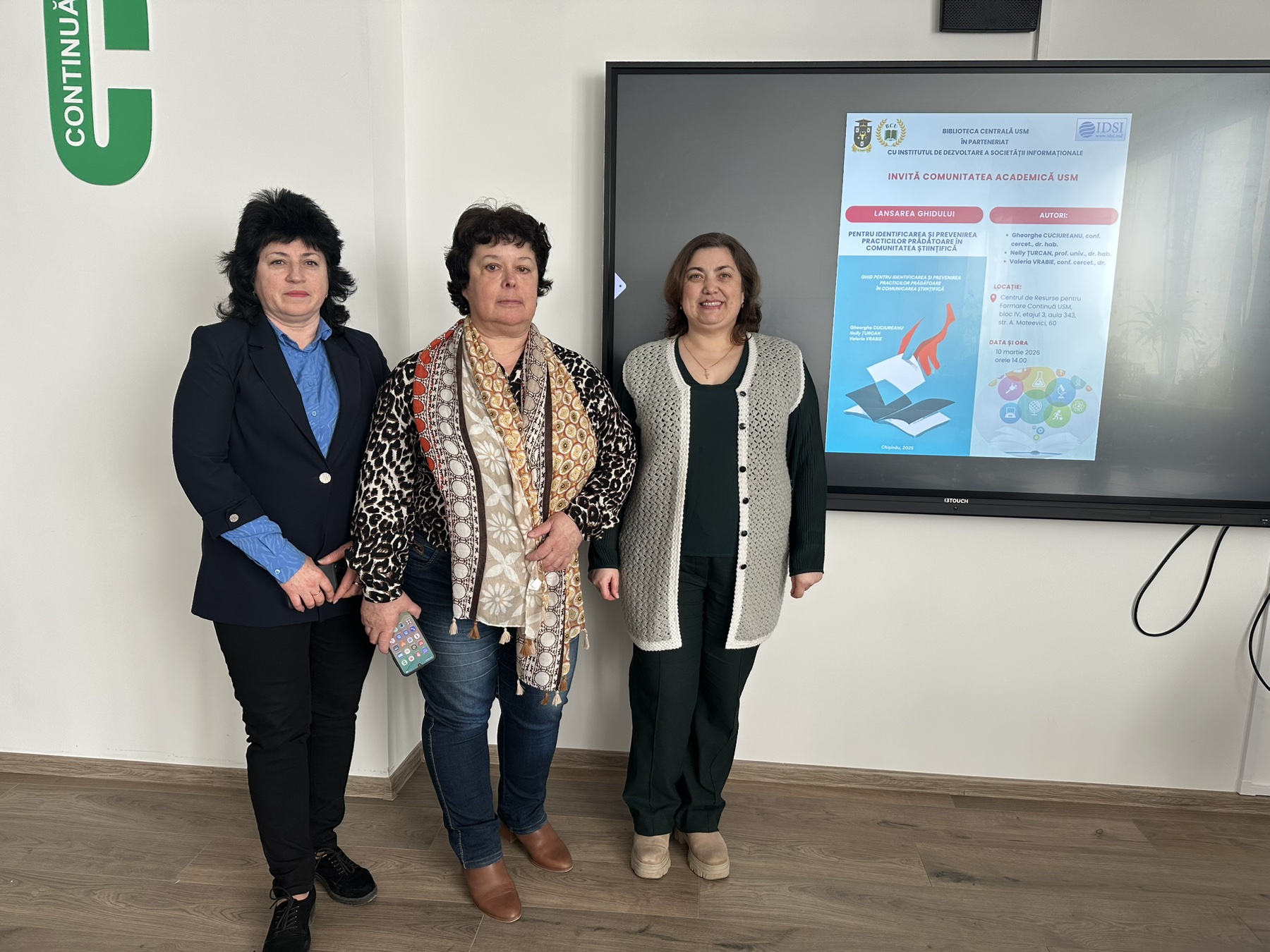 La data de 10 martie 2026, Biblioteca Centrală USM, în parteneriat cu Institutul de Dezvoltare a Societății Informaționale, a lansat „Ghidul pentru identificarea și prevenirea practicilor prădătoare în comunitatea științifică”, elaborat de Gheorghe Cuciureanu, conf. cerc., dr. hab.; Nelly Țurcan, prof. univ., dr. hab.; Valeria Vrabie, conf. cerc., dr.